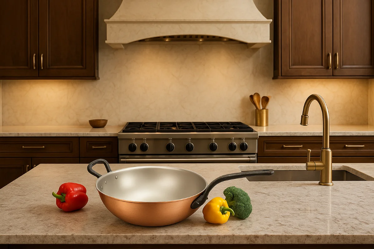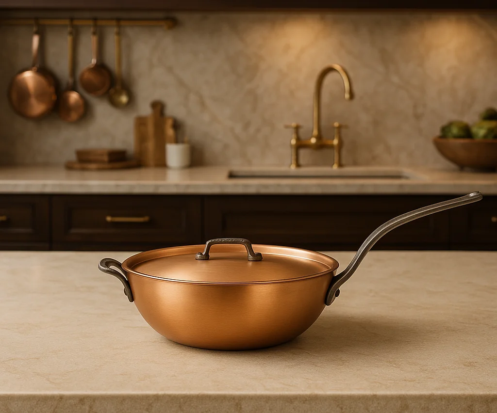 Der robuste Griff aus Gusseisen bietet sicheren Halt, während die Höhe des Pfannenkörpers von 9,3 cm ausreichend Platz für umfangreiche Zubereitungen bietet. Mit einem Gewicht von 2210 g und einer Gesamtlänge von 44,8 cm vereint die Pfanne Stabilität und Funktionalität. Die Falk Culinair Fusion Risottopfanne aus Kupfer überzeugt durch ihre langlebige Verarbeitung und vielseitige Einsatzmöglichkeiten in der Küche – ein zuverlässiges Werkzeug für versierte und anspruchsvolle Köche.
